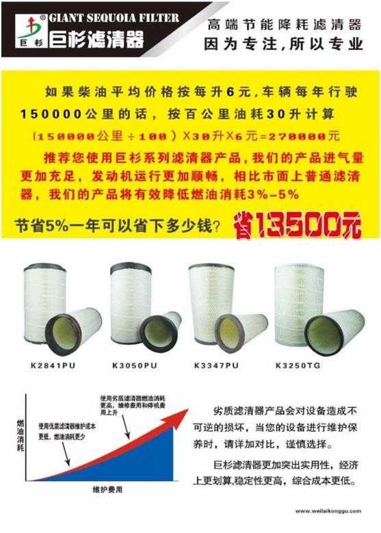 购买空气滤清器一定要选择适合工况的产品,巨杉节油型滤清器,万公里节约燃油150升。